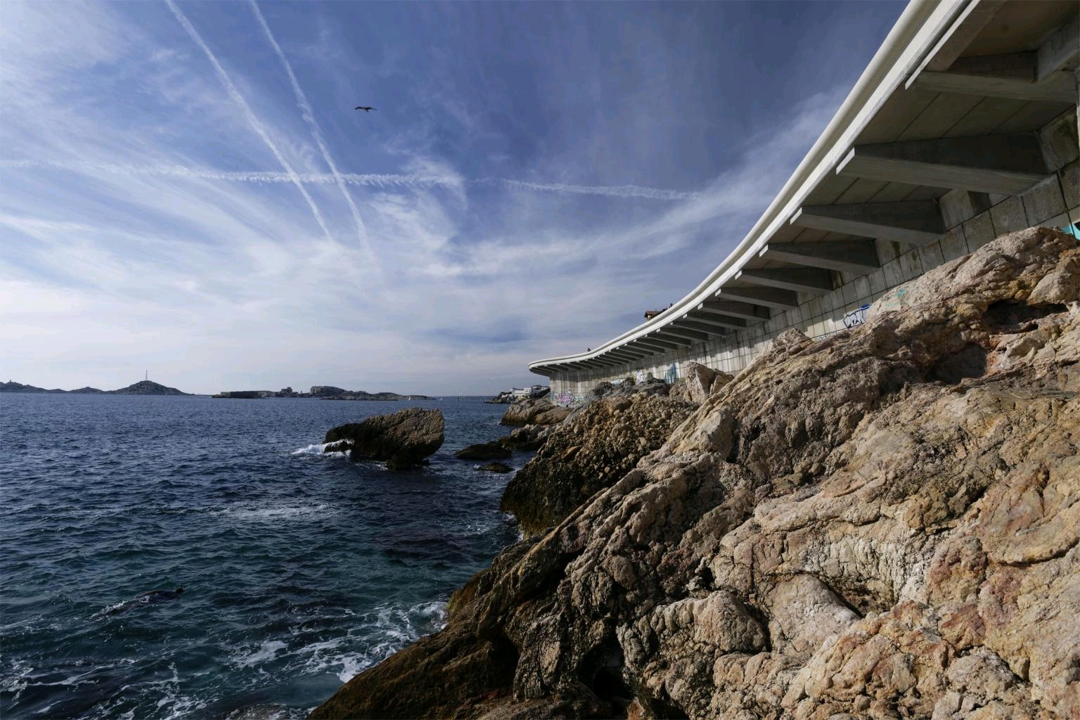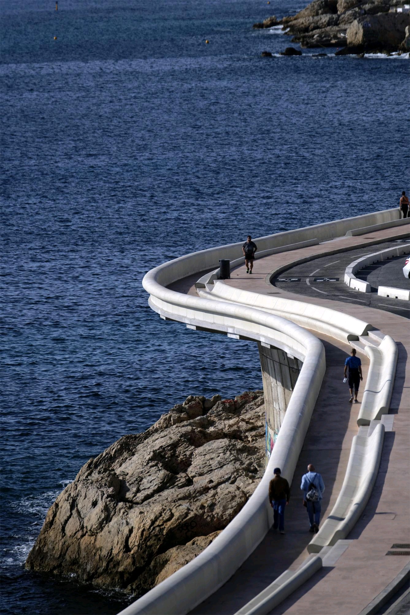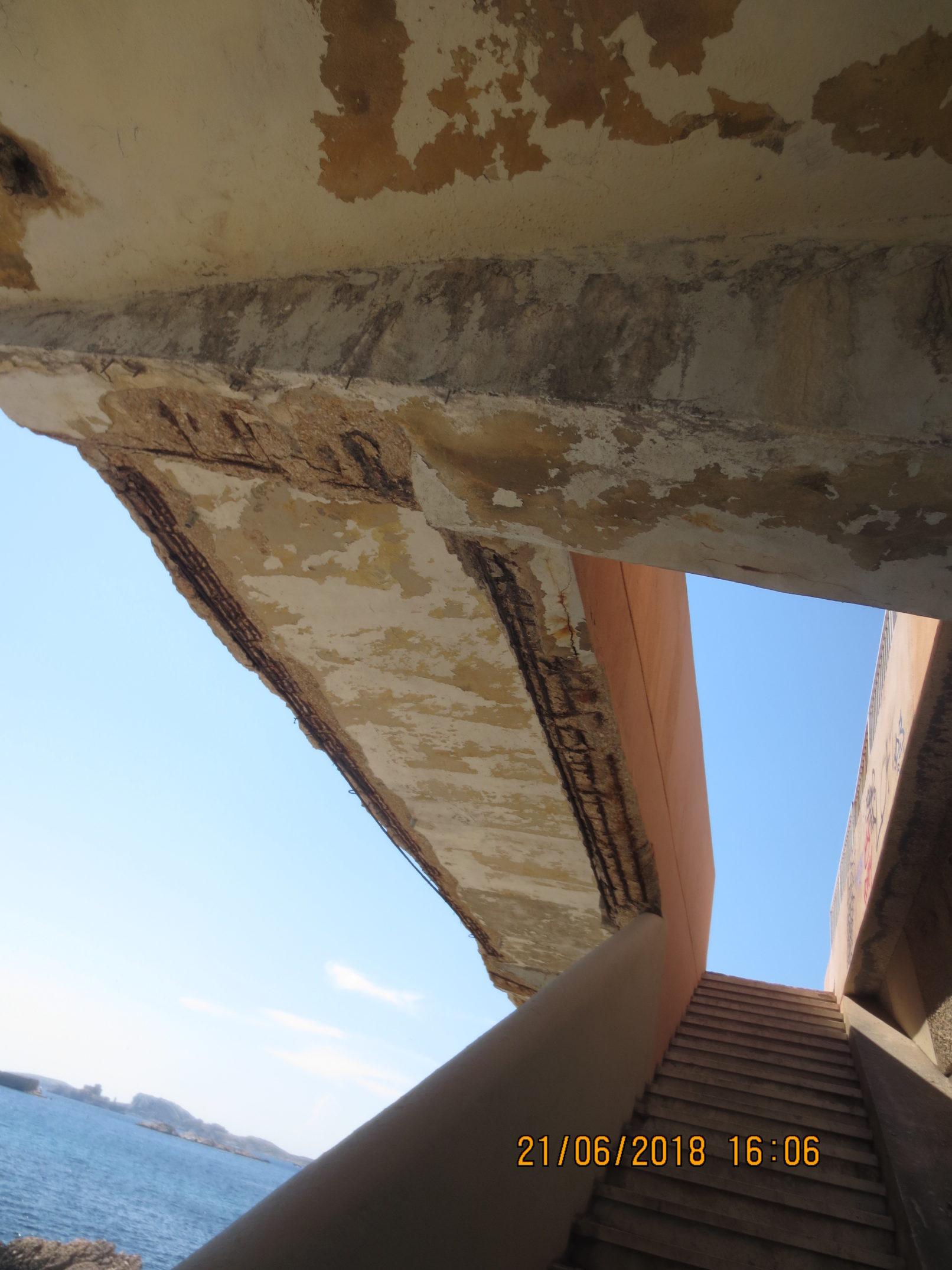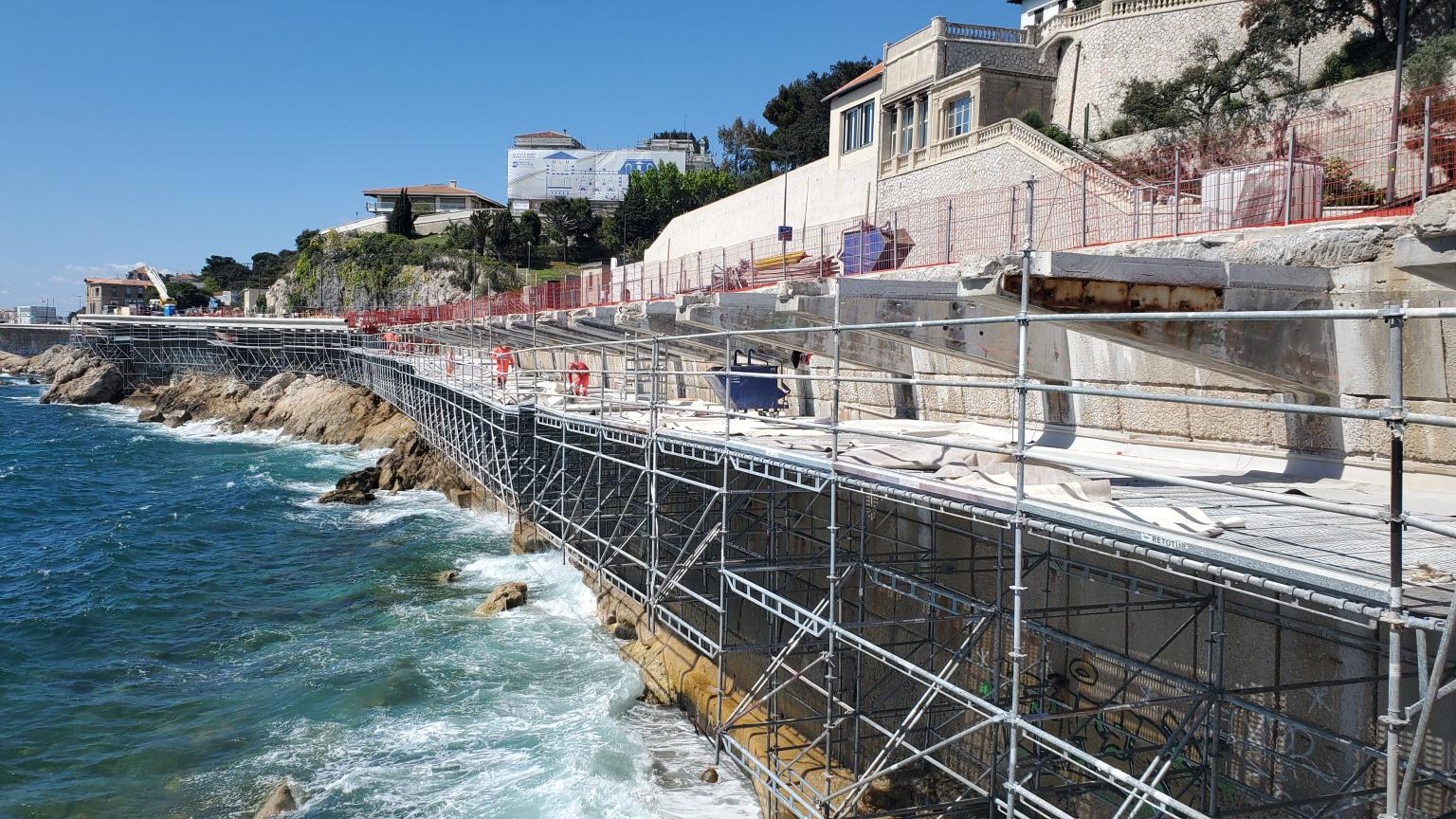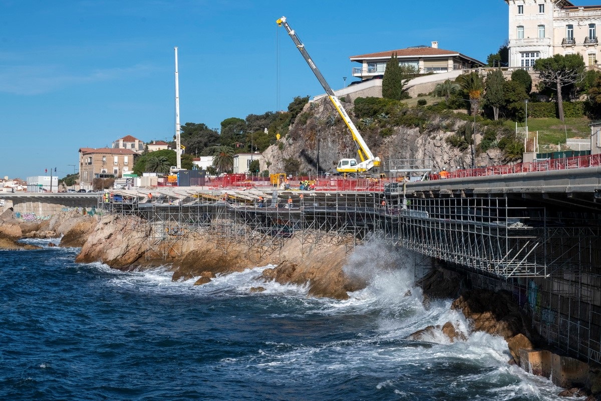 Route emblématique de la côte marseillaise, la corniche Kennedy souffre des attaques répétées des embruns et de l’air marin sur sa structure en béton armé. En 2018 une campagne de travaux de restauration et de consolidation est lancée : réparations et renforcements des consoles en béton armé, remplacements des parapets et bancs existants par de nouveaux éléments en béton fibré à ultra-hautes performances (BFUHP) et des dalles existantes par de nouvelles dalles préfabriquées (sur place). Les consoles trop corrodées par les aléas de la mer sont entièrement remplacées par de nouvelles consoles scellées dans la roche. Celles qui ont été moins oxydées sont protégées par la mise en place d’une protection cathodique par courant imposé.